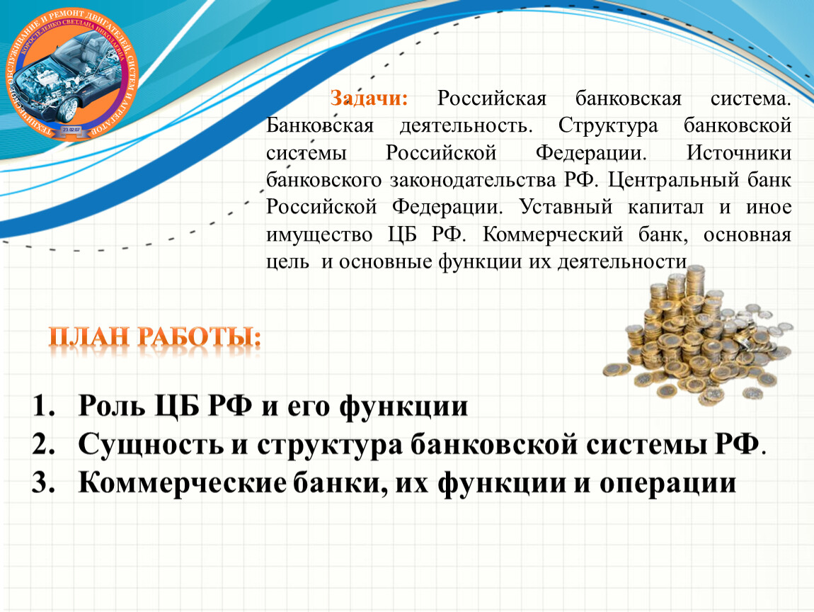 Задачи: Российская банковская система. Банковская деятельность. Структура банковской системы Российской Федерации. Источники банковского законодательства РФ. Центральный банк Российской Федерации. Уставный капитал и иное имущество ЦБ РФ. Коммерческий банк, основная цель и основные функции их деятельности.