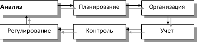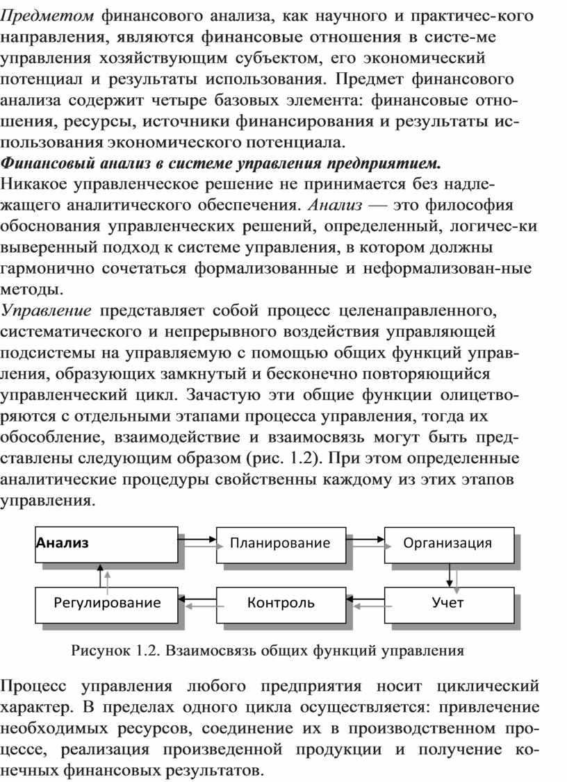 Управление представляет собой процесс целенаправленного, систематического и непрерывного воздействия управляющей подсистемы на управляемую с помощью общих функций управ- ления, образующих замкнутый и бесконечно повторяющийся управленческий цикл. Зачастую эти общие функции олицетво- ряются с отдельными этапами процесса управления, тогда их обособление, взаимодействие и взаимосвязь могут быть пред- ставлены следующим образом (рис. 1.2). При этом определенные аналитические процедуры свойственны каждому из этих этапов управления.