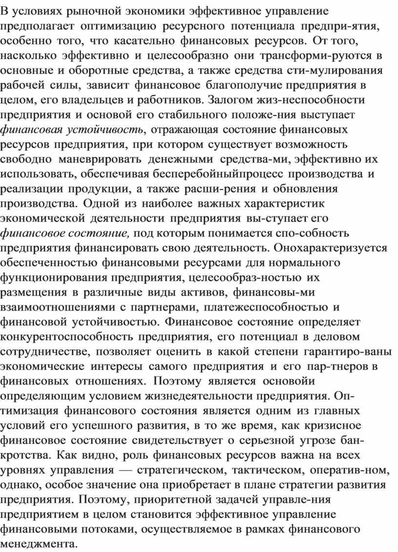 В условиях рыночной экономики эффективное управление предполагает оптимизацию ресурсного потенциала предпри- ятия, особенно того, что касательно финансовых ресурсов. От того, насколько эффективно и целесообразно они трансформи- руются в основные и оборотные средства, а также средства сти- мулирования рабочей силы, зависит финансовое благополучие предприятия в целом, его владельцев и работников. Залогом жиз- неспособности предприятия и основой его стабильного положе- ния выступает финансовая устойчивость, отражающая состояние финансовых ресурсов предприятия, при котором существует возможность свободно маневрировать денежными средства- ми, эффективно их использовать, обеспечивая бесперебойный процесс производства и реализации продукции, а также расши- рения и обновления производства. Одной из наиболее важных характеристик экономической деятельности предприятия вы- ступает его финансовое состояние, под которым понимается спо- собность предприятия финансировать свою деятельность. Оно характеризуется обеспеченностью финансовыми ресурсами для нормального функционирования предприятия, целесообраз- ностью их размещения в различные виды активов, финансовы- ми взаимоотношениями с партнерами, платежеспособностью и финансовой устойчивостью. Финансовое состояние определяет конкурентоспособность предприятия, его потенциал в деловом сотрудничестве, позволяет оценить в какой степени гарантиро- ваны экономические интересы самого предприятия и его пар- тнеров в финансовых отношениях. Поэтому является основой и определяющим условием жизнедеятельности предприятия. Оп- тимизация финансового состояния является одним из главных условий его успешного развития, в то же время, как кризисное финансовое состояние свидетельствует о серьезной угрозе бан- кротства. Как видно, роль финансовых ресурсов важна на всех уровнях управления — стратегическом, тактическом, оператив- ном, однако, особое значение она приобретает в плане стратегии развития предприятия. Поэтому, приоритетной задачей управле- ния предприятием в целом становится эффективное управление финансовыми потоками, осуществляемое в рамках финансового менеджмента.