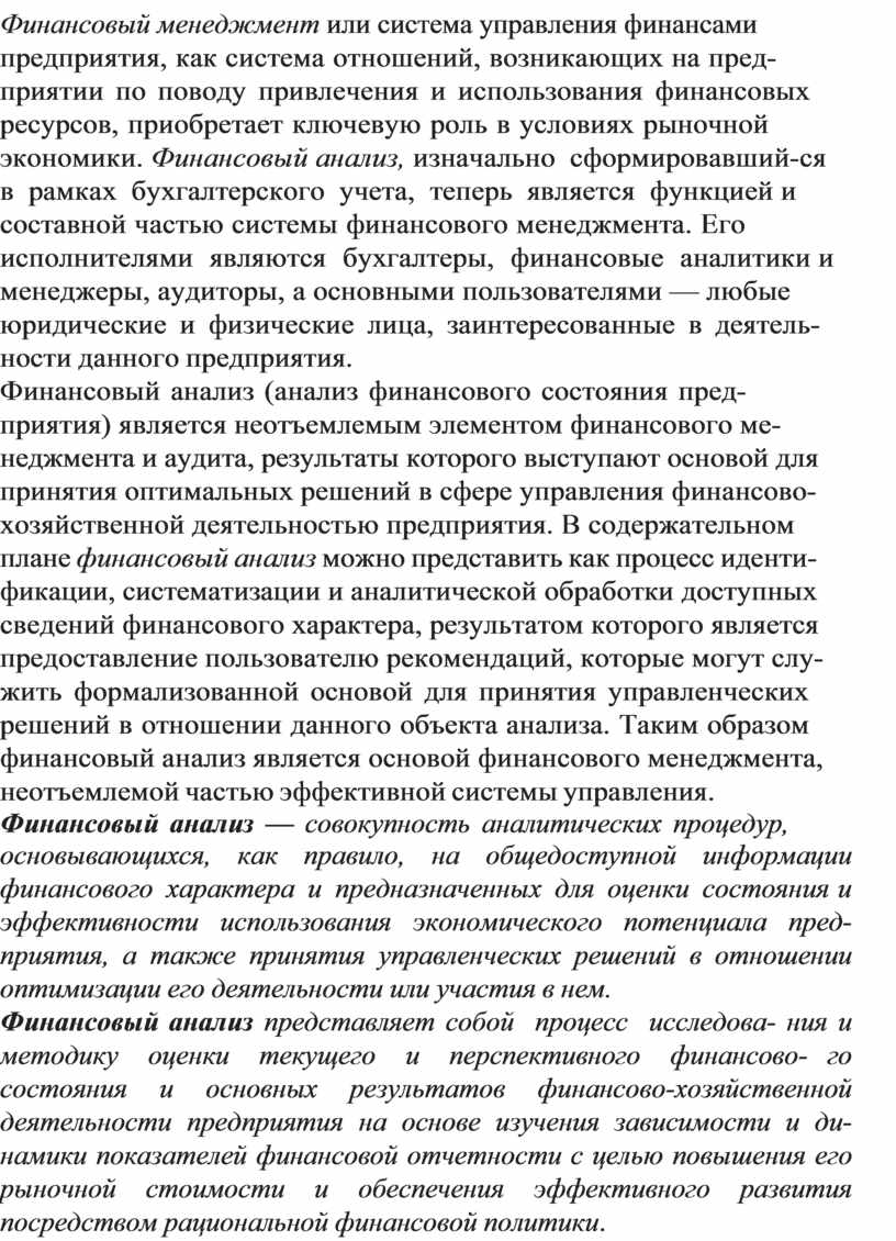 Финансовый менеджмент или система управления финансами предприятия, как система отношений, возникающих на пред- приятии по поводу привлечения и использования финансовых ресурсов, приобретает ключевую роль в условиях рыночной экономики. Финансовый анализ, изначально сформировавший- ся в рамках бухгалтерского учета, теперь является функцией и составной частью системы финансового менеджмента. Его исполнителями являются бухгалтеры, финансовые аналитики и менеджеры, аудиторы, а основными пользователями — любые юридические и физические лица, заинтересованные в деятель- ности данного предприятия.