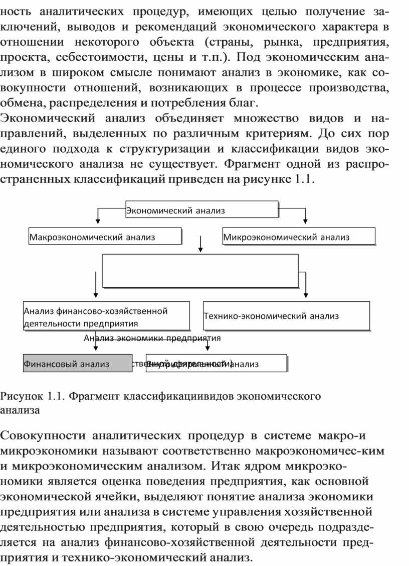 Экономический анализ объединяет множество видов и на- правлений, выделенных по различным критериям. До сих пор единого подхода к структуризации и классификации видов эко- номического анализа не существует. Фрагмент одной из распро- страненных классификаций приведен на рисунке 1.1.