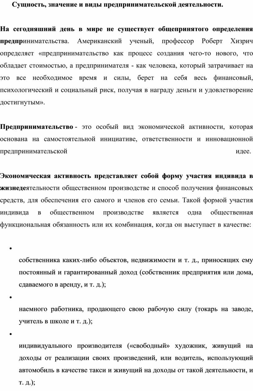 Сущность, значение и виды предпринимательской деятельности.