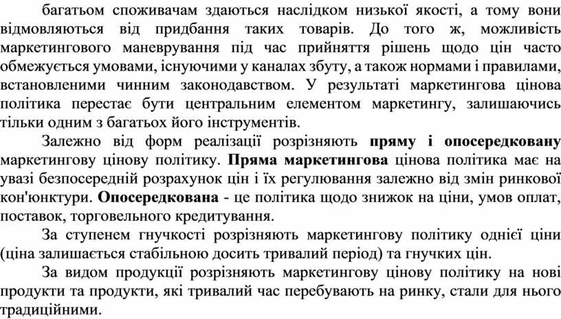 Маркетингова цінова політика - це комплекс заходів, до якого належать визначення ціни, знижок, умов оплати за товари чи послуги з метою задоволення потреб споживачів і забезпечення прибутку фірми.