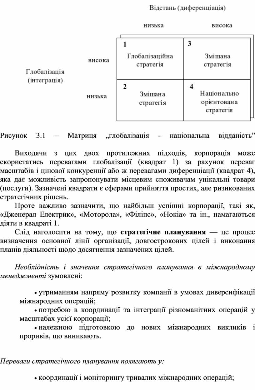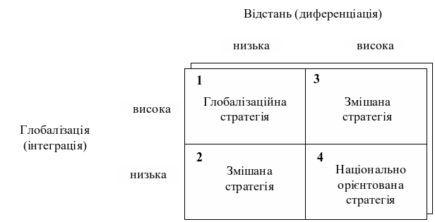 Виходячи з цих двох протилежних підходів, корпорація може скористатись перевагами глобалізації (квадрат 1) за рахунок переваг масштабів і цінової конкуренції або ж перевагами диференціації (квадрат 4), яка дає можливість запропонувати місцевим споживачам унікальні товари (послуги). Зазначені квадрати є сферами прийняття простих, але ризикованих стратегічних рішень.