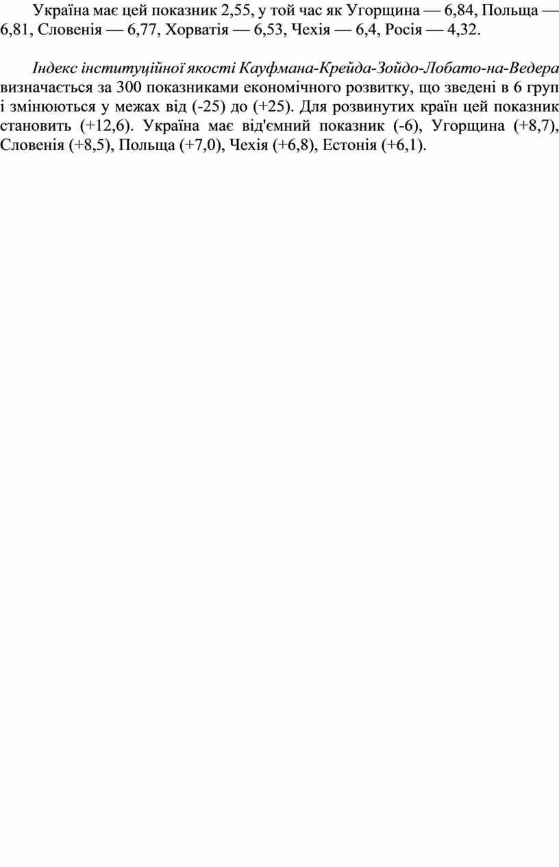 Індекс інституційної якості Кауфмана-Крейда-Зойдо-Лобато-на-Ведера визначається за 300 показниками економічного розвитку, що зведені в 6 груп і змінюються у межах від (-25) до (+25). Для розвинутих країн цей показник становить (+12,6). Україна має від'ємний показник (-6), Угорщина (+8,7), Словенія (+8,5), Польща (+7,0), Чехія (+6,8), Естонія (+6,1).
