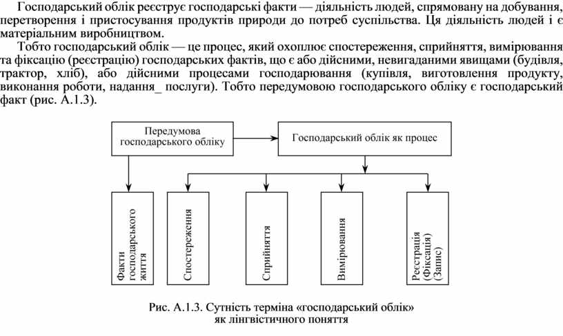 Тобто господарський облік — це процес, який охоплює спостереження, сприйняття, вимірювання та фіксацію (реєстрацію) господарських фактів, що є або дійсними, невигаданими явищами (будівля, трактор, хліб), або дійсними процесами господарювання (купівля, виготовлення продукту, виконання роботи, надання_ послуги). Тобто передумовою господарського обліку є господарський факт (рис. А.1.3).