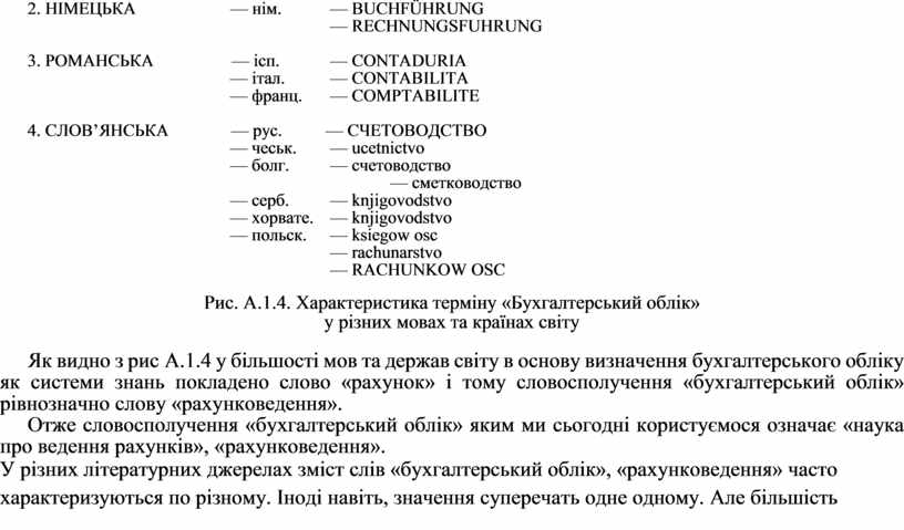 Як видно з рис А.1.4 у більшості мов та держав світу в основу визначення бухгалтерського обліку як системи знань покладено слово «рахунок» і тому словосполучення «бухгалтерський облік» рівнозначно слову «рахунковедення».