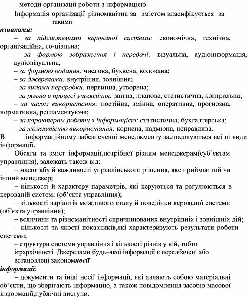 – структури системи управління і кількості рівнів у ній, тобто ієрархічності. Джерелами будь–якої інформації є передбачені або встановлені закономносії