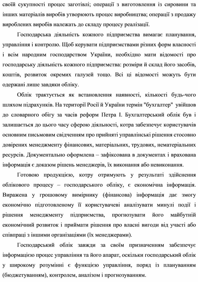 Готовою продукцією, котру отримують у результаті здійснення облікового процесу – господарського обліку, є економічна інформація. Виражена у грошовому вимірнику (фінансова) інформація дає змогу економічно підготовленому її користувачеві аналізувати минулі події і рішення менеджменту підприємства, прогнозувати його майбутній економічний розвиток і приймати рішення про власні вигоди від участі або співпраці з іншими організаціями (їх менеджерами).