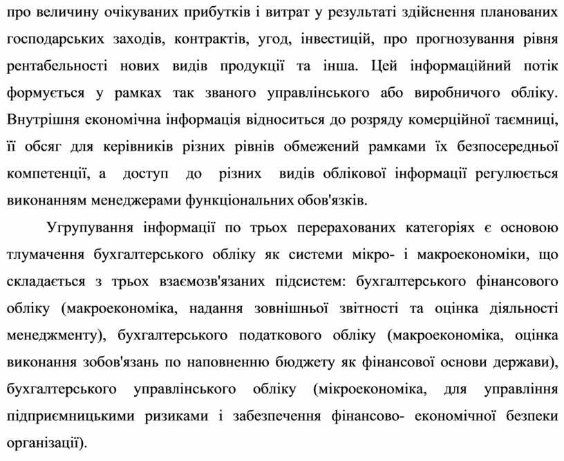 Угрупування інформації по трьох перерахованих категоріях є основою тлумачення бухгалтерського обліку як системи мікро- і макроекономіки, що складається з трьох взаємозв'язаних підсистем: бухгалтерського фінансового обліку (макроекономіка, надання зовнішньої звітності та оцінка діяльності менеджменту), бухгалтерського податкового обліку (макроекономіка, оцінка виконання зобов'язань по наповненню бюджету як фінансової основи держави), бухгалтерського управлінського обліку (мікроекономіка, для управління підприємницькими ризиками і забезпечення фінансово- економічної безпеки організації).