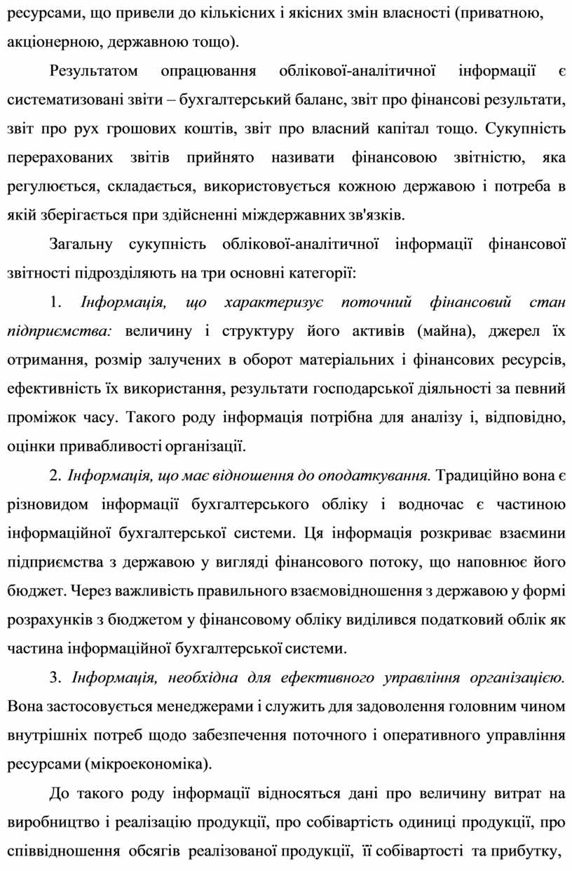 Результатом опрацювання облікової-аналітичної інформації є систематизовані звіти – бухгалтерський баланс, звіт про фінансові результати, звіт про рух грошових коштів, звіт про власний капітал тощо. Сукупність перерахованих звітів прийнято називати фінансовою звітністю, яка регулюється, складається, використовується кожною державою і потреба в якій зберігається при здійсненні міждержавних зв'язків.