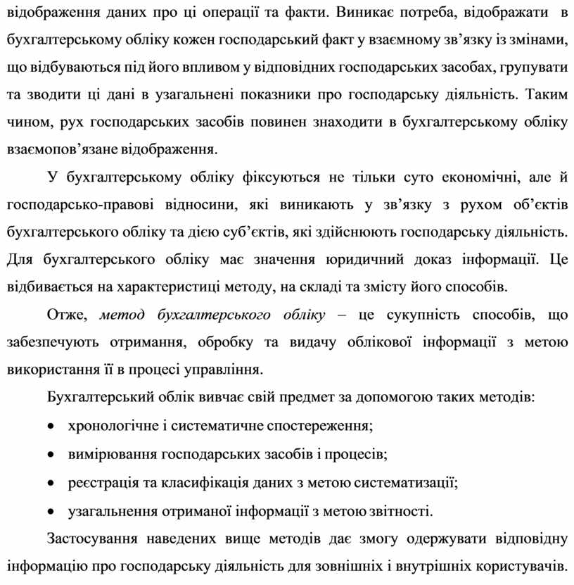 Метод бухгалтерського обліку дає змогу відображати рух і стан економічних об’єктів, які складають його предмет. Рисою, що відрізняє бухгалтерський облік від інших видів господарського обліку, є послідовна системність їх відображення.