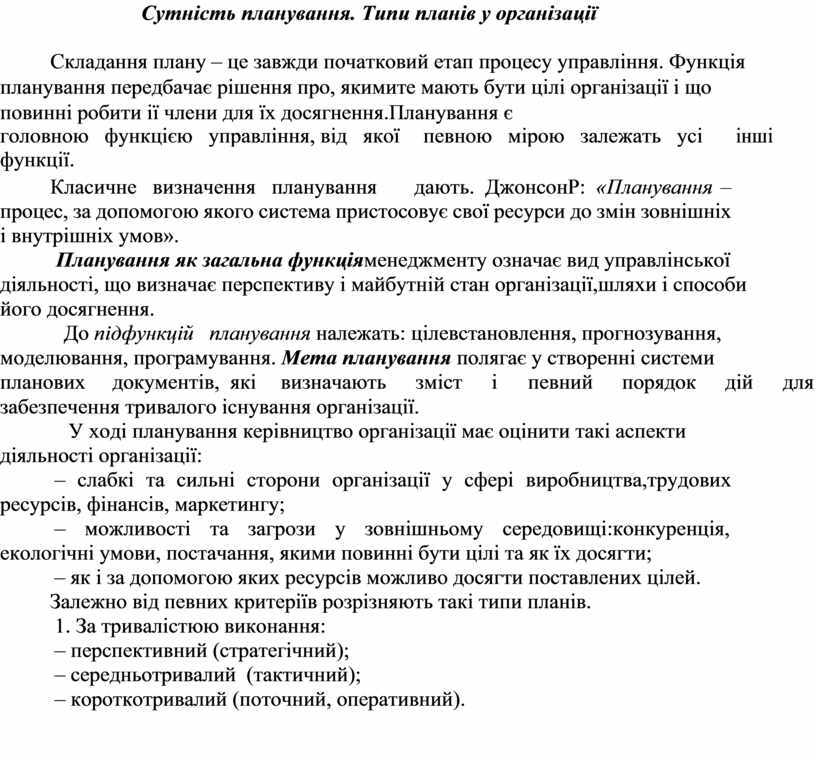 Планування як загальна функціяменеджменту означає вид управлінської діяльності, що визначає перспективу і майбутній стан організації,шляхи і способи