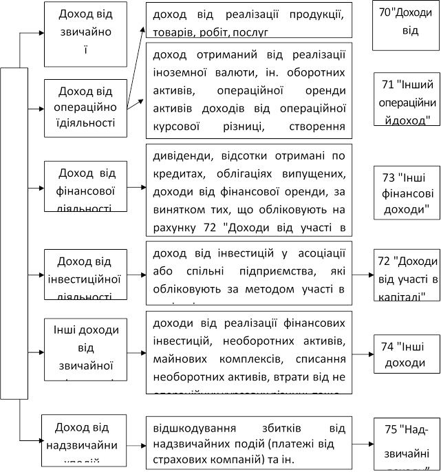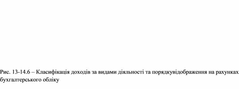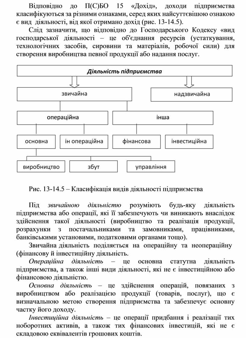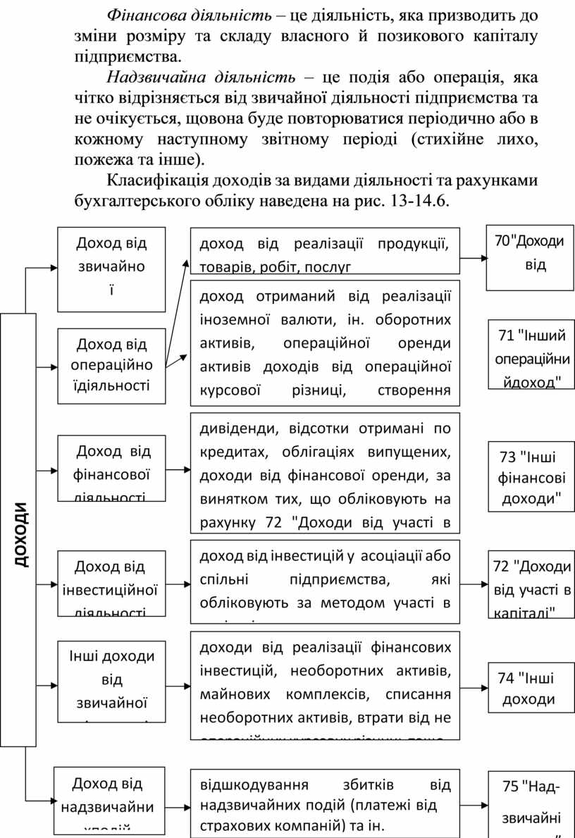 Відповідно до П(С)БО 15 «Дохід», доходи підприємства класифікуються за різними ознаками, серед яких найсуттєвішою ознакою є вид діяльності, від якої отримано дохід (рис. 13-14.5).