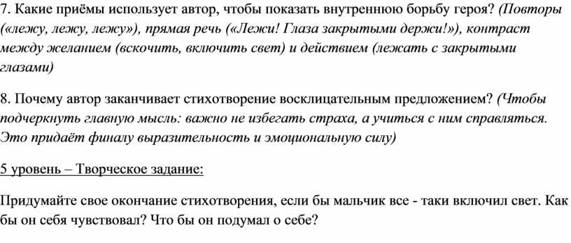 7. Какие приёмы использует автор, чтобы показать внутреннюю борьбу героя? (Повторы («лежу, лежу, лежу»), прямая речь («Лежи! Глаза закрытыми держи!»), контраст между желанием (вскочить, включить свет) и действием (лежать с закрытыми глазами)