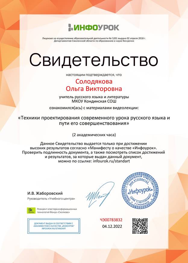 Свидетельство Техники проектирования современного урока русского языка.docx