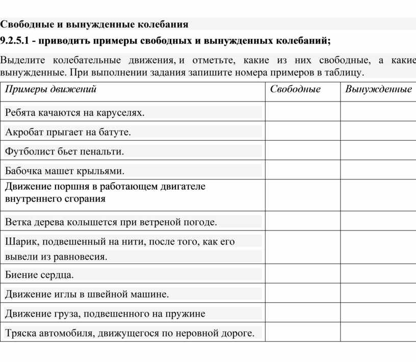 Выделите колебательные движения, и отметьте, какие из них свободные, а какие вынужденные. При выполнении задания запишите номера примеров в таблицу.