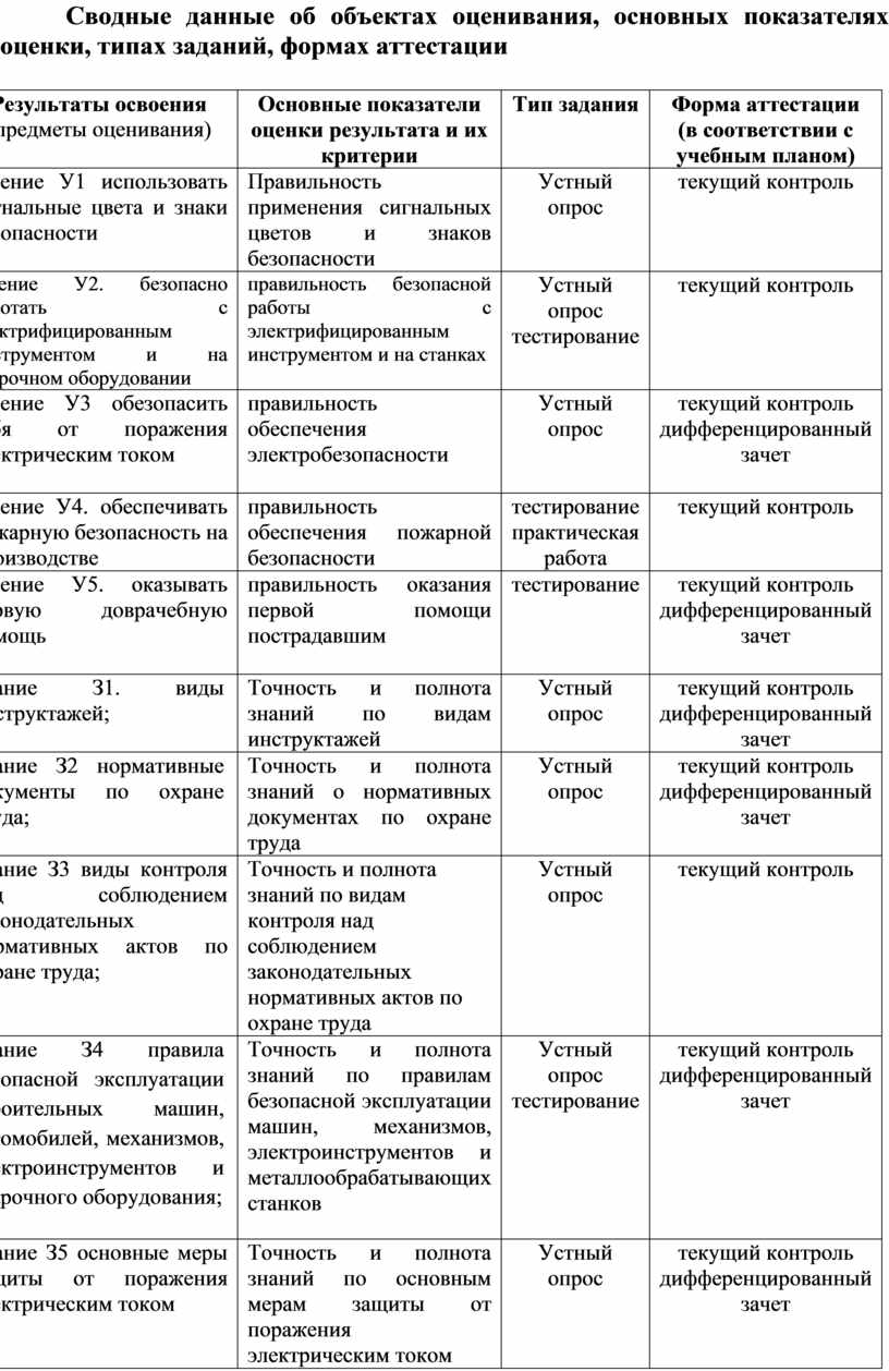 Сводные данные об объектах оценивания, основных показателях оценки, типах заданий, формах аттестации