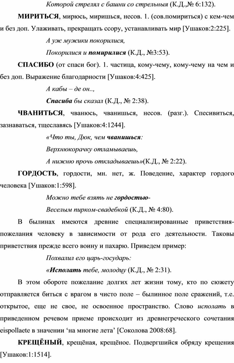 Следующими по частоте являются лексемы, производные от слова поклон. Встречаются они в отобранных нами глаголах 42 раза из 500 (8,4 %). Большую часть составляют глагол поклониться (23 из 42) и кланяться (9 из 42). Глаголы поклониться и кланяться в сборнике Кирши Данилова в основном имеют значение ‘наклонить голову или верхнюю часть туловища в знак приветствия, благодарности, покорности’.