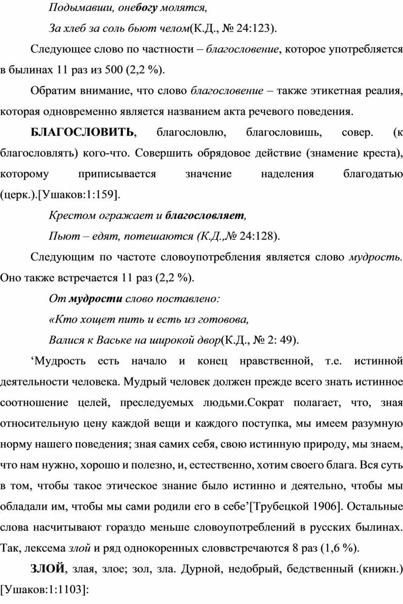 ‘Мудрость есть начало и конец нравственной, т.е. истинной деятельности человека. Мудрый человек должен прежде всего знать истинное соотношение целей, преследуемых людьми.Сократ полагает, что, зная относительную цену каждой вещи и каждого поступка, мы имеем разумную норму нашего поведения; зная самих себя, свою истинную природу, мы знаем, что нам нужно, хорошо и полезно, и, естественно, хотим своего блага. Вся суть в том, чтобы такое этическое знание было истинно и деятельно, чтобы мы обладали им, чтобы мы сами родили его в себе’[Трубецкой 1906]. Остальные слова насчитывают гораздо меньше словоупотреблений в русских былинах. Так, лексема злой и ряд однокоренных словвстречаются 8 раз (1,6 %).