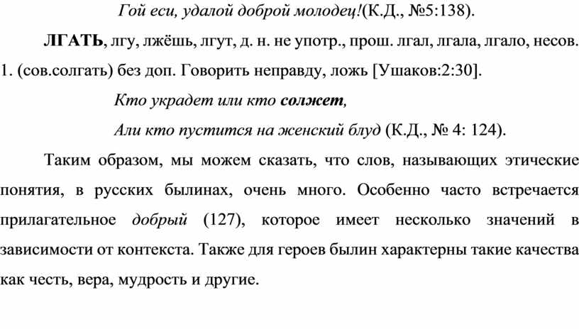 Таким образом, мы можем сказать, что слов, называющих этические понятия, в русских былинах, очень много. Особенно часто встречается прилагательное добрый (127), которое имеет несколько значений в зависимости от контекста. Также для героев былин характерны такие качества как честь, вера, мудрость и другие.