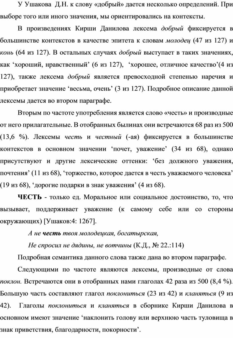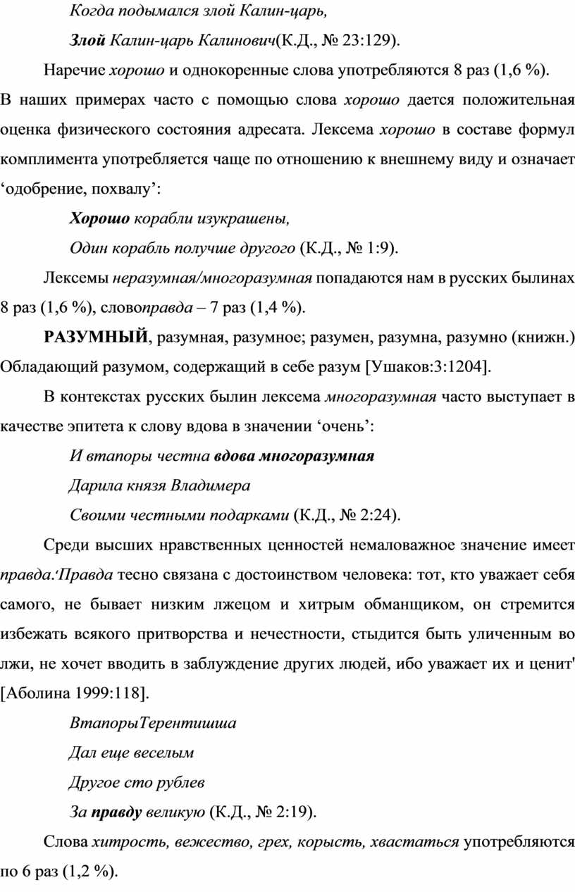 Материалом для нашего исследования послужил сборник «Древние российские стихотворения, собранные Киршею Даниловым», включающим 26 классических былинных сюжетов и 45 произведений других жанров – исторических песен, баллад, духовных стихов, эпических скоморошин и пародий, несколько лирических песен. Из книги было отобрано 500 слов, лексика которых номинирует этические понятия, и, соответственно, сделано 500 карточек. Проанализировав картотеку и подсчитав количество словоупотреблений, мы обнаружили, что самым частотным словом, встречающимся в былинах, является слово «добрый». Частота, с которой это слово появляется на страницах сборника – 127 из 500 (25,4 %).