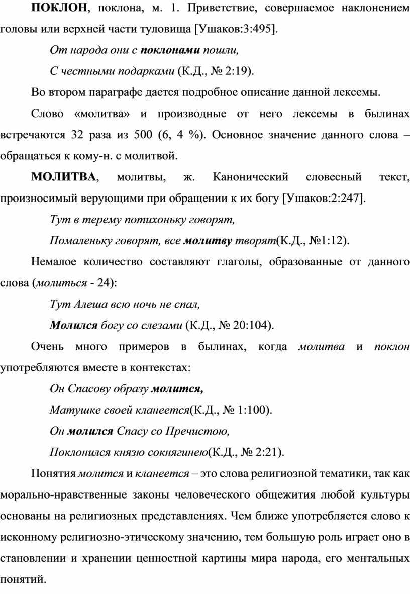 Слово «молитва» и производные от него лексемы в былинах встречаются 32 раза из 500 (6, 4 %). Основное значение данного слова –обращаться к кому-н. с молитвой.