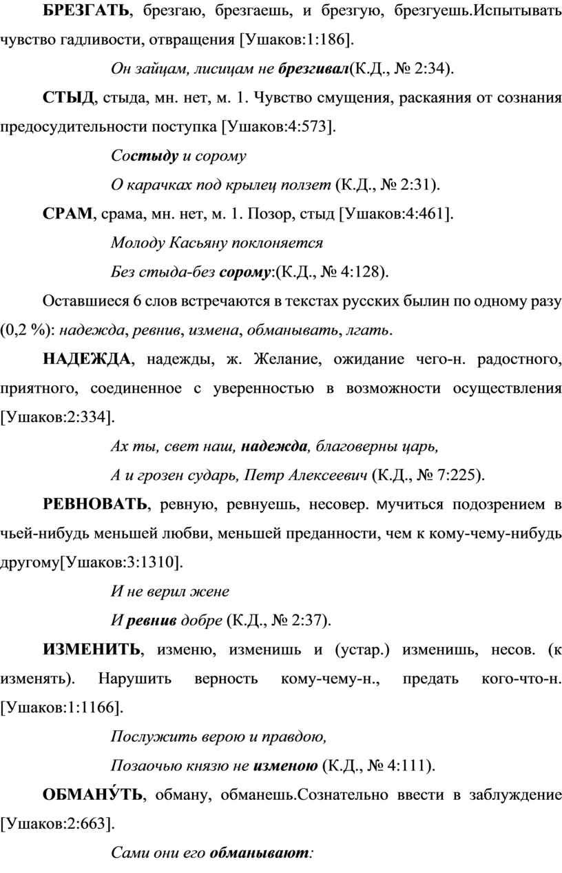 Оставшиеся 6 слов встречаются в текстах русских былин по одному разу (0,2 %): надежда, ревнив, измена, обманывать, лгать.