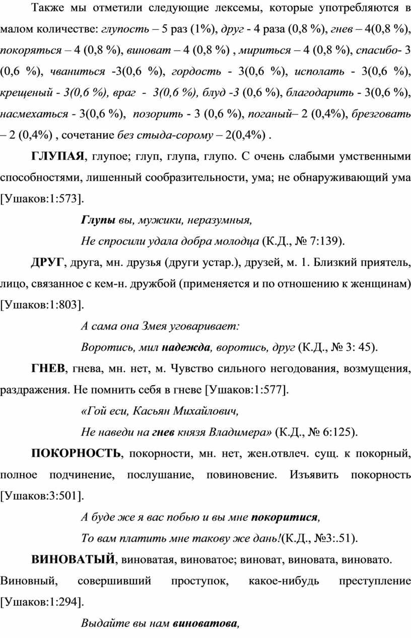 Также мы отметили следующие лексемы, которые употребляются в малом количестве: глупость – 5 раз (1%), друг - 4 раза (0,8 %), гнев – 4(0,8 %), покоряться – 4 (0,8 %), виноват – 4 (0,8 %) , мириться – 4 (0,8 %), спасибо- 3 (0,6 %), чваниться -3(0,6 %), гордость - 3(0,6 %), исполать - 3(0,6 %), крещеный - 3(0,6 %), враг - 3(0,6 %), блуд -3 (0,6 %), благодарить - 3(0,6 %), насмехаться - 3(0,6 %), позорить - 3 (0,6 %), поганый– 2 (0,4%), брезговать – 2 (0,4%) , сочетание без стыда-сорому – 2(0,4%) .