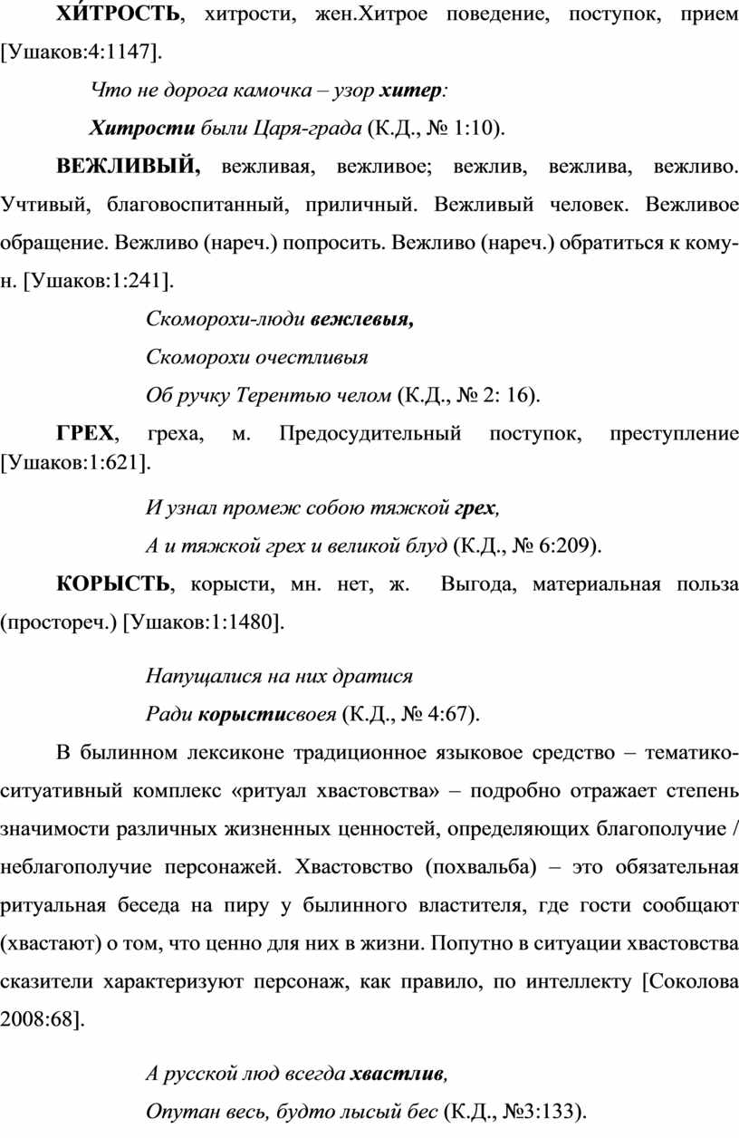 В былинном лексиконе традиционное языковое средство – тематико-ситуативный комплекс «ритуал хвастовства» – подробно отражает степень значимости различных жизненных ценностей, определяющих благополучие / неблагополучие персонажей. Хвастовство (похвальба) – это обязательная ритуальная беседа на пиру у былинного властителя, где гости сообщают (хвастают) о том, что ценно для них в жизни. Попутно в ситуации хвастовства сказители характеризуют персонаж, как правило, по интеллекту [Соколова 2008:68].