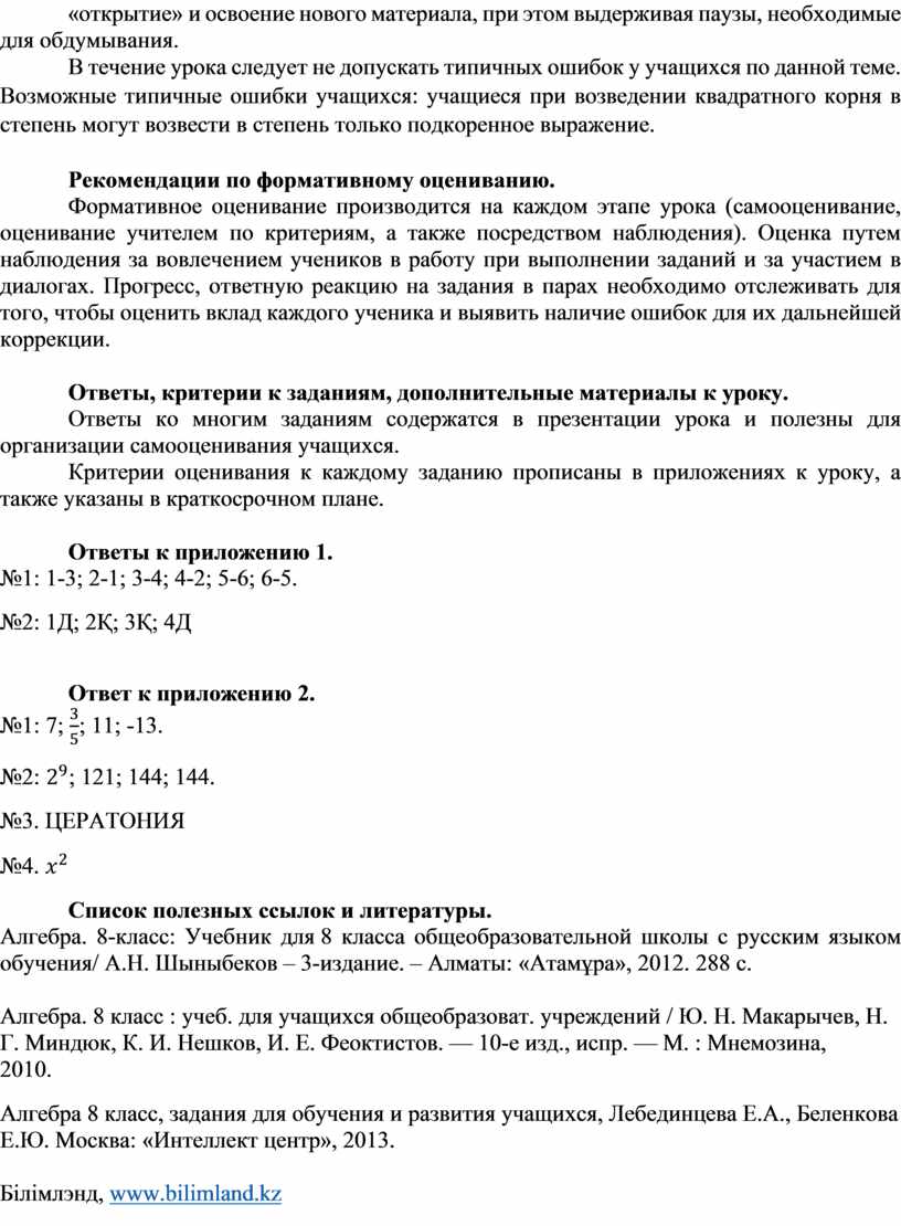 Демонстрация материала осуществляется с помощью презентации PowerPoint. Слайды презентации содержат анимации, которые позволяют поэтапно вывести на экран решения и ответы к предложенным заданиям или продемонстрировать ответы на заданные вопросы, которые удобно использовать для организации самооценивания. Перед показом слайдов учителю следует ознакомиться с презентацией. Необходимый материал для урока был взят из учебников и с сайта www.bilimland.kz. Если имеется подписка на этот сайт, то можно использовать его ресурсы при подготовке уроков.