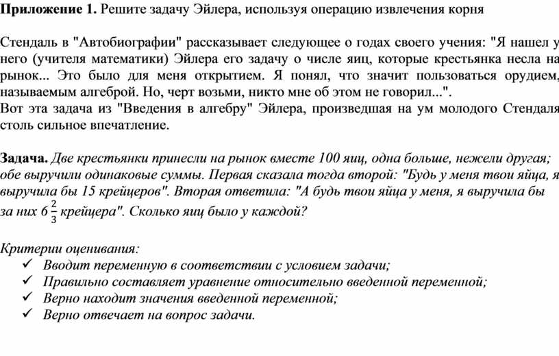 Стендаль в "Автобиографии" рассказывает следующее о годах своего учения: "Я нашел у него (учителя математики) Эйлера его задачу о числе яиц, которые крестьянка несла на рынок... Это было для меня открытием. Я понял, что значит пользоваться орудием, называемым алгеброй. Но, черт возьми, никто мне об этом не говорил...".