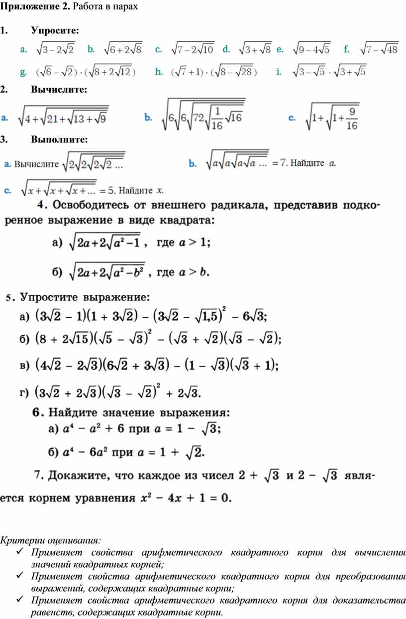 ü Применяет свойства арифметического квадратного корня для преобразования выражений, содержащих квадратные корни;