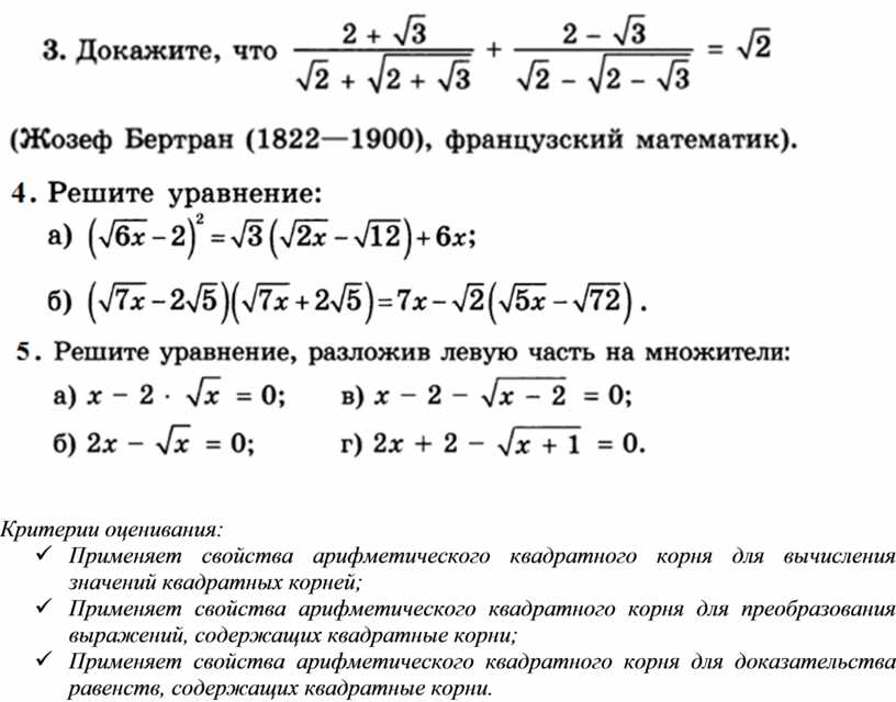 ü Применяет свойства арифметического квадратного корня для доказательства равенств, содержащих квадратные корни.