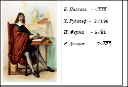 Далее учитель дает учащимся историческую информацию о Рене Декарте. Рене Декарт (1596-1650) - французский математик и философы. Главным философско-математическим результатом работы Рене Декарта стало написание книги «Рассуждение о методе». Книга содержала несколько приложений. Одно приложение содержало азы аналитической геометрии. Другое приложение включало в себя правила изучения оптических приборов и явлений, достижения Декарта в этой отрасли (впервые правильно составил закон преломления света). Ученый ввел используемый сейчас показатель степени, черту над выражением, которое взято под корень, начал обозначать неизвестные символами «x, y, z», а постоянные величины – символами «a, b, c». Математик также разработал каноническую форму уравнений, которая и сегодня используется при решении (когда в правой части уравнения оказывается нуль). |
