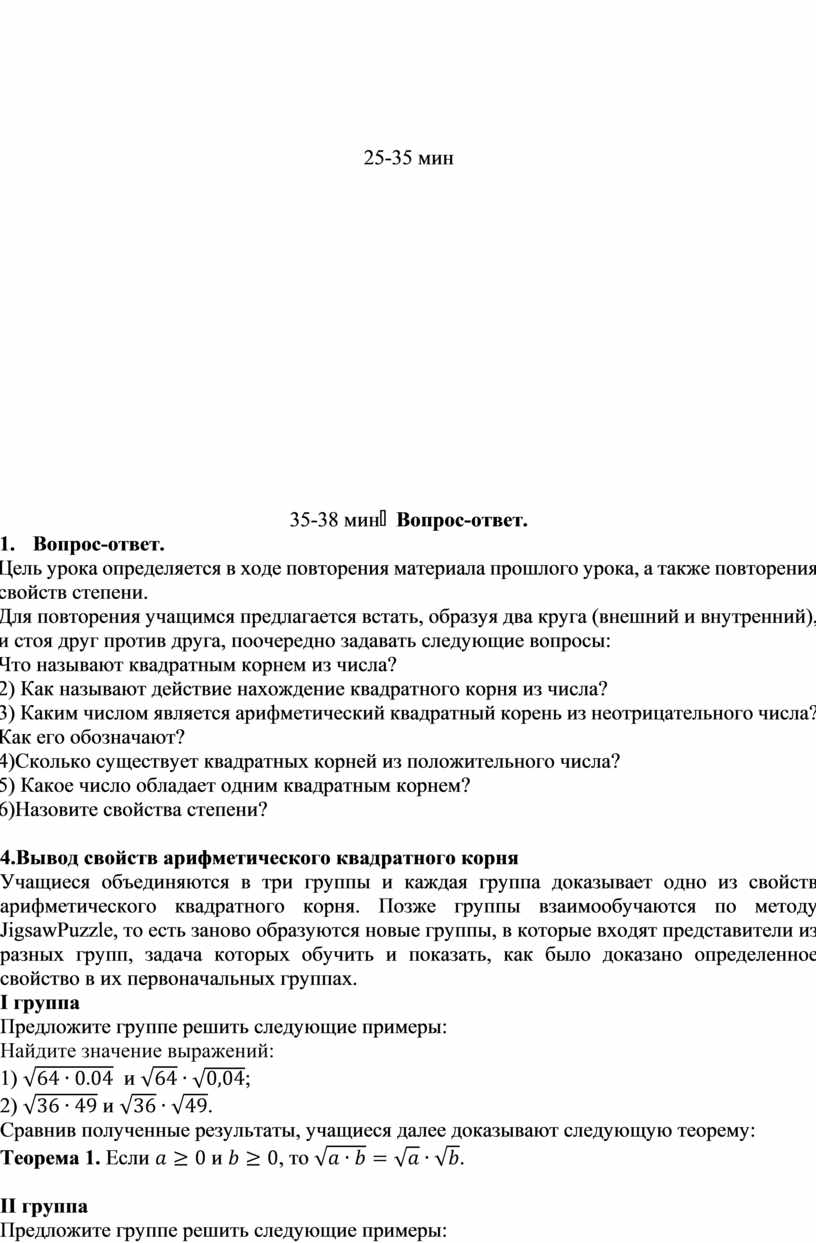4.Вывод свойств арифметического квадратного корня Учащиеся объединяются в три группы и каждая группа доказывает одно из свойств арифметического квадратного корня. Позже группы взаимообучаются по методу JigsawPuzzle, то есть заново образуются новые группы, в которые входят представители из разных групп, задача которых обучить и показать, как было доказано определенное свойство в их первоначальных группах. І группа Предложите группе решить следующие примеры: Найдите значение выражений: 1) 2) Сравнив полученные результаты, учащиеся далее доказывают следующую теорему: Теорема 1. Если