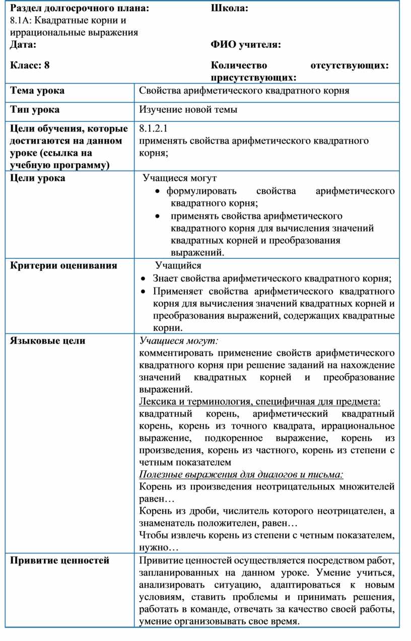 Учащийся · Знает свойства арифметического квадратного корня; · Применяет свойства арифметического квадратного корня для вычисления значений квадратных корней и преобразования выражений, содержащих квадратные корни. |