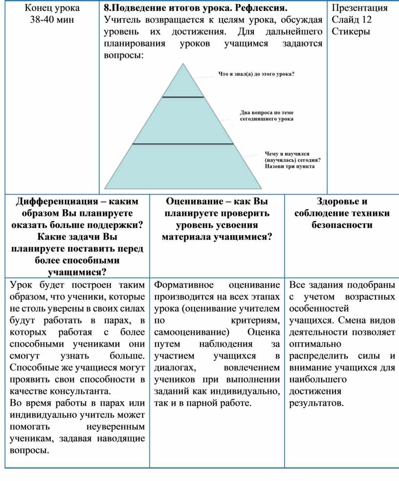 8.Подведение итогов урока. Рефлексия. Учитель возвращается к целям урока, обсуждая уровень их достижения. Для дальнейшего планирования уроков учащимся задаются вопросы: