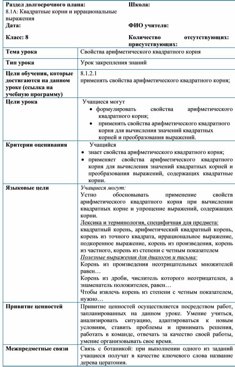 Учащийся · знает свойства арифметического квадратного корня; · применяет свойства арифметического квадратного корня для вычисления значений квадратных корней и преобразования выражений, содержащих квадратные корни. |