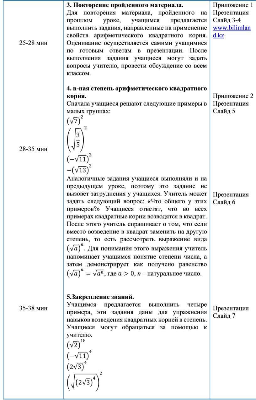 4. n-ная степень арифметического квадратного корня. Сначала учащиеся решают следующие примеры в малых группах: