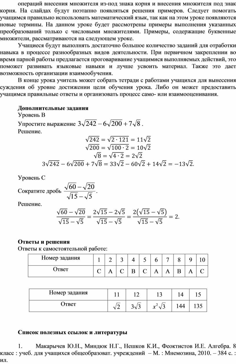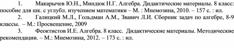 2. Макарычев Ю.Н., Миндюк Н.Г. Алгебра. Дидактические материалы. 8 класс: пособие для шк. с углубл. изучением математики – М. : Мнемозина, 2010. – 157 с. : ил.