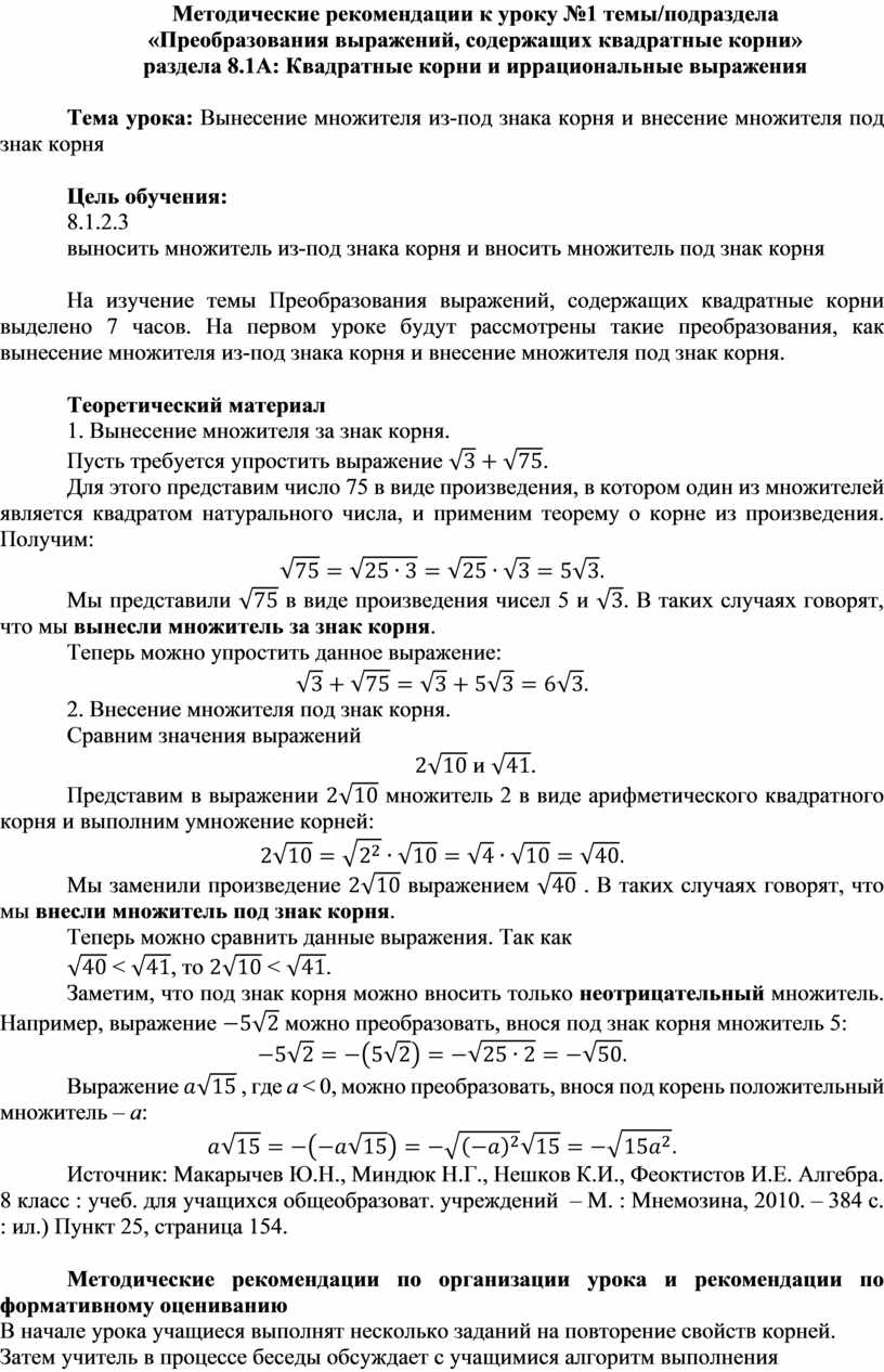 На изучение темы Преобразования выражений, содержащих квадратные корни выделено 7 часов. На первом уроке будут рассмотрены такие преобразования, как вынесение множителя из-под знака корня и внесение множителя под знак корня.