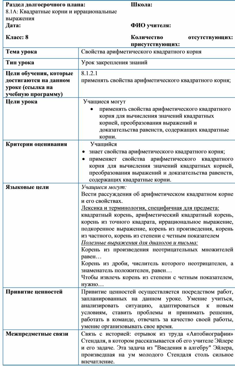 Учащиеся могут · применять свойства арифметического квадратного корня для вычисления значений квадратных корней, преобразования выражений и доказательства равенств, содержащих квадратные корни. |