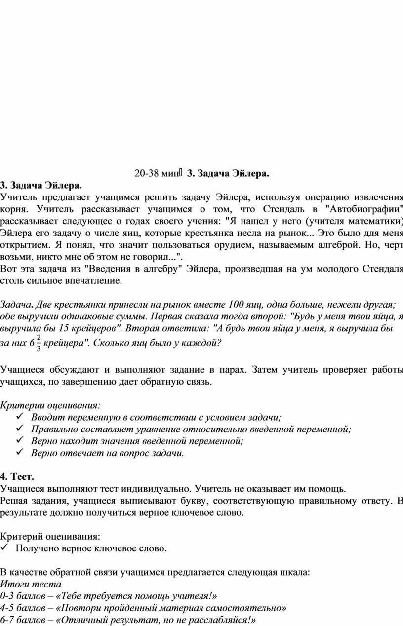 3. Задача Эйлера. Учитель предлагает учащимся решить задачу Эйлера, используя операцию извлечения корня. Учитель рассказывает учащимся о том, что Стендаль в "Автобиографии" рассказывает следующее о годах своего учения: "Я нашел у него (учителя математики) Эйлера его задачу о числе яиц, которые крестьянка несла на рынок... Это было для меня открытием. Я понял, что значит пользоваться орудием, называемым алгеброй. Но, черт возьми, никто мне об этом не говорил...". Вот эта задача из "Введения в алгебру" Эйлера, произведшая на ум молодого Стендаля столь сильное впечатление.