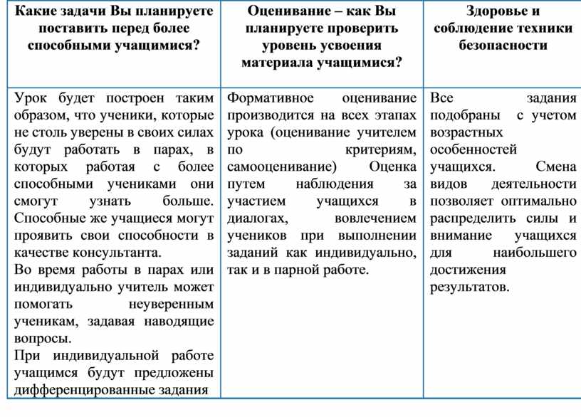 Дифференциация – каким образом Вы планируете оказать больше поддержки? Какие задачи Вы планируете поставить перед более способными учащимися? |