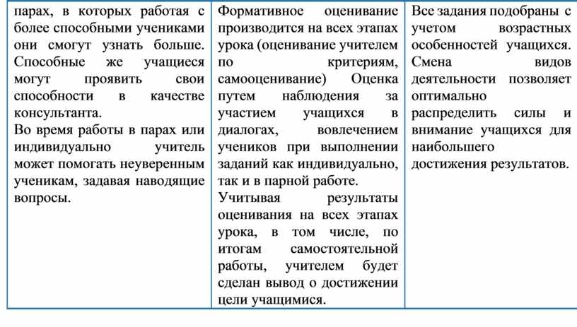 Урок будет построен таким образом, что ученики, которые не столь уверены в своих силах будут работать в парах, в которых работая с более способными учениками они смогут узнать больше. Способные же учащиеся могут проявить свои способности в качестве консультанта. Во время работы в парах или индивидуально учитель может помогать неуверенным ученикам, задавая наводящие вопросы.