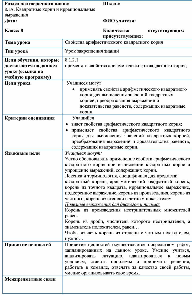 Учащиеся могут · применять свойства арифметического квадратного корня для вычисления значений квадратных корней, преобразования выражений и доказательства равенств, содержащих квадратные корни. |