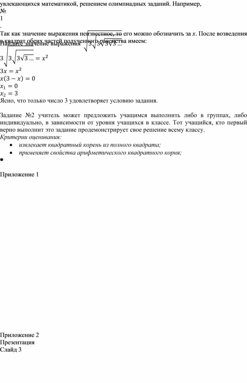 4. Решение дополнительных задач. Учитель предлагает учащимся выполнить задания с несколькими радикалами. Сначала учитель объясняет, что если нужно извлечь корень из корня, то нужно начать вычисления с нахождения значения «внутреннего» корня. Например,