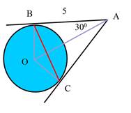Прямые АВ и АС касаются окружности с центром О в точках В и С. Найдите ВС, если< ОАВ=300, АВ=5 см.