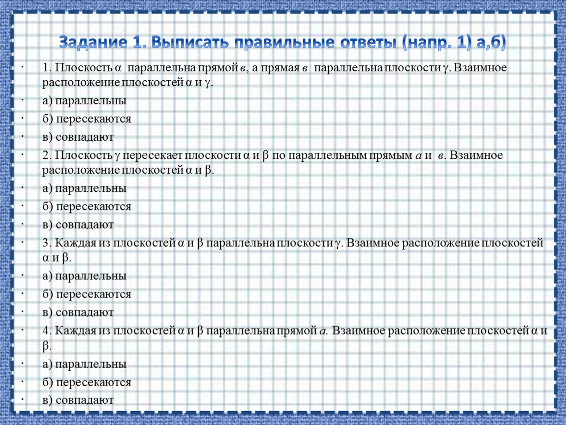 Задание 1. Выписать правильные ответы (напр. 1) а,б)